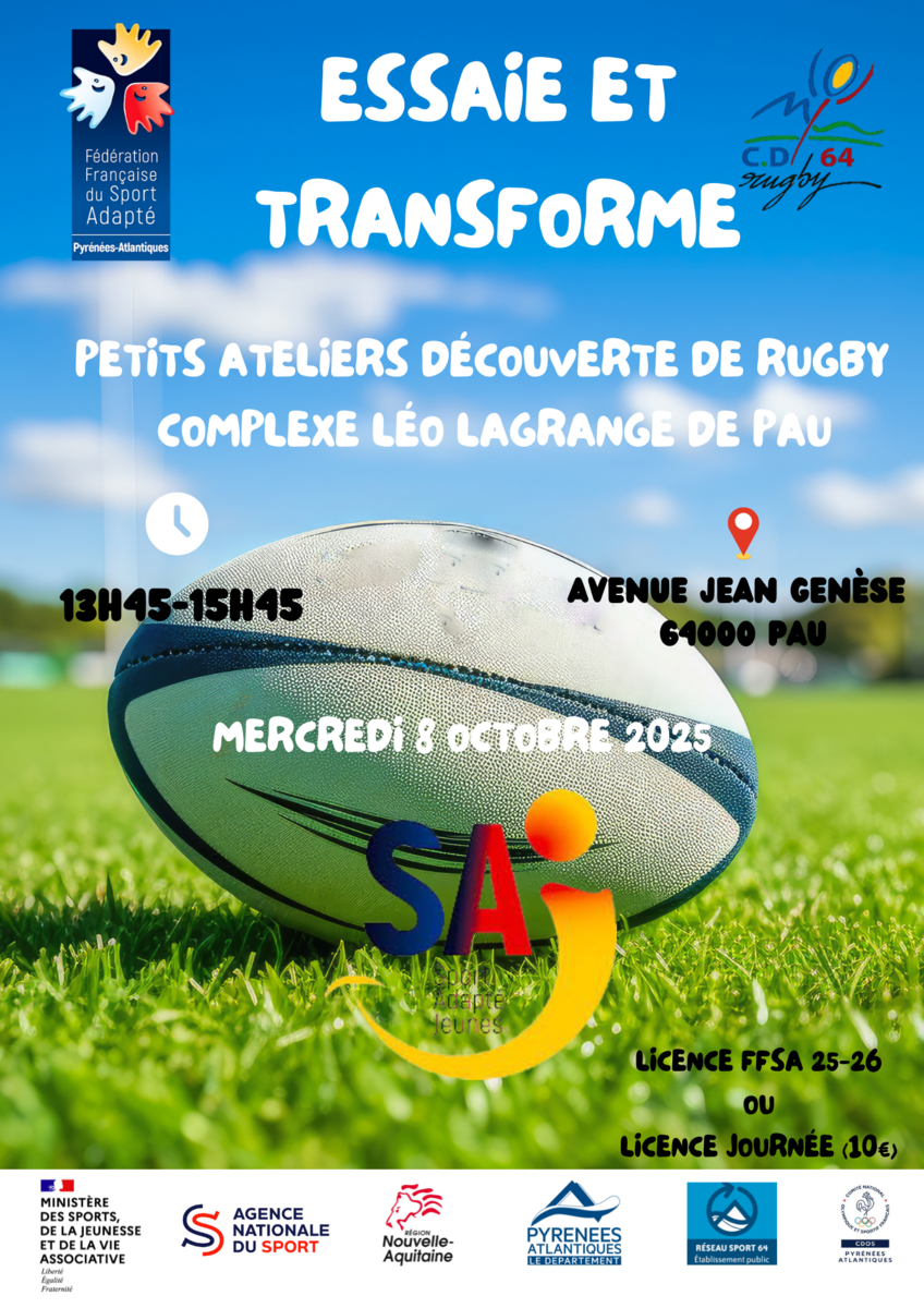 Cette journée sportive est organisée en partenariat avec le Comité de Rugby 64. Il s'agit d'une après-midi sur le thème du rugby composée de petits ateliers animés par les jeunes des sections sportives des collèges. Les équipes seront composées des enfants du Sport Adapté et des enfants des sections sportives des collèges.