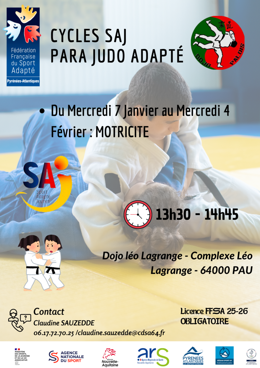 Activité Judo : Dojo Léo Lagrange - Rue Jean Genèse - 64000 PAU - Horaires : 13h45-14h45. Séances composées d'ateliers de travail au sol, d'immobilisation etc sur le principe du judo.