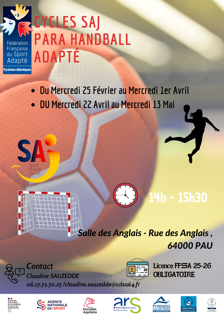 Activité Handball : à la salle des Anglais - 64000 PAU - Horaires : 14h-15h30. Séances composées d'ateliers puis de mini opposition