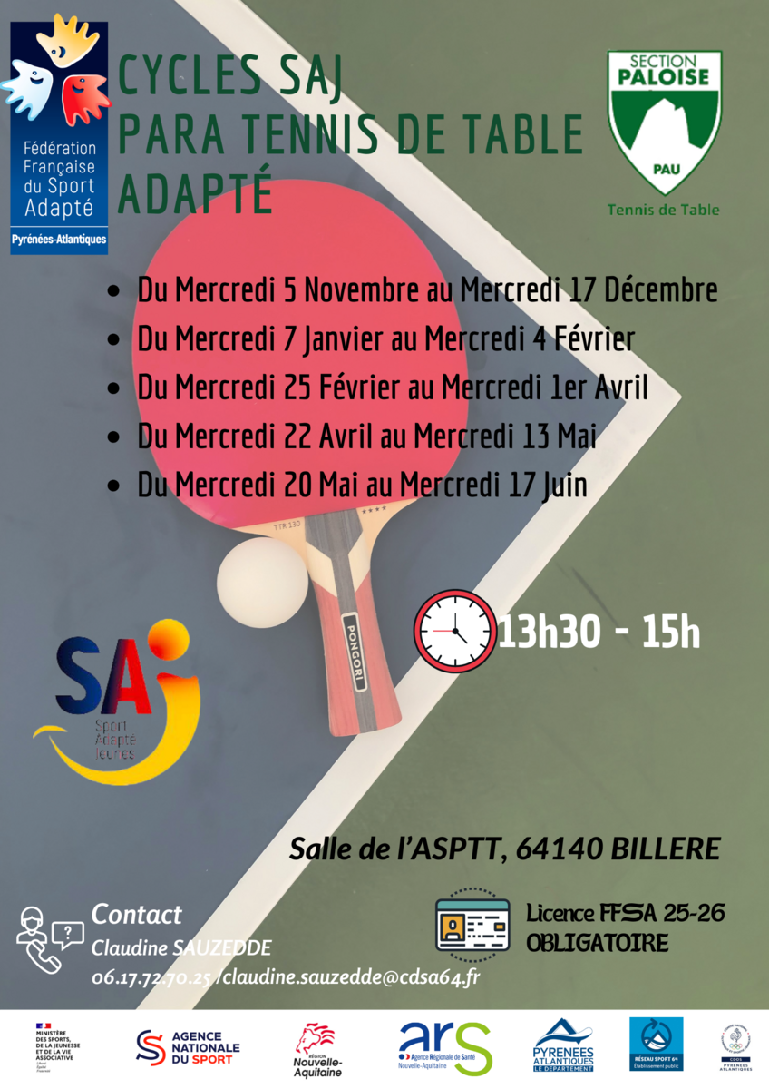 Activité Tennis de Table : à la salle de l'ASPTT - Avenue de Lons - 64140 BILLERE - Horaires : 13h30-15h. Séances composées de plusieurs petits ateliers ludiques de précision. Ce créneau est également le créneau du club, ce qui peut permettre de faire une passerelle entre le Sport Adapté et la Section Paloise.