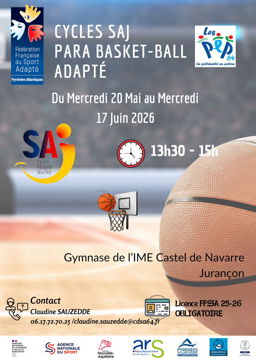 Activité Basket-ball : au gymnase de l'IME Castel de Navarre -1 impasse d'Oly - 64110 JURANCON - Horaires : 13h30-15h. Séances composées de plusieurs petits ateliers autour du basket. Ce créneau est également le créneau de l'IME Castel de Navarre, et se pratique donc avec les autres jeunes de l'IME qui seront du nombre de 5 à 8 personnes, âgées de 15 à 18 ans.