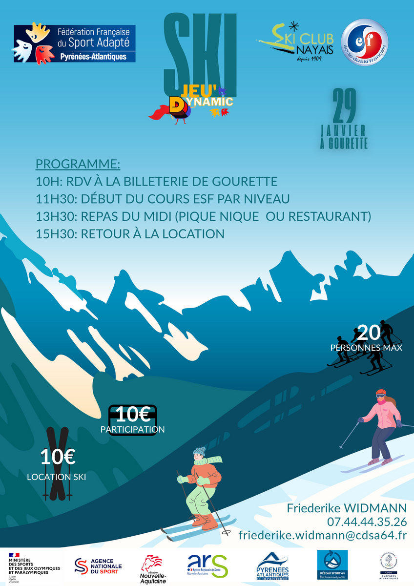 La location de matériel (ski - bâtons - chaussures - casque) ainsi que les repas sont à votre charge. Un partenariat avec Intersport Gourette permet de louer le pack matériel à 10€/personne (fiche d'inscription).