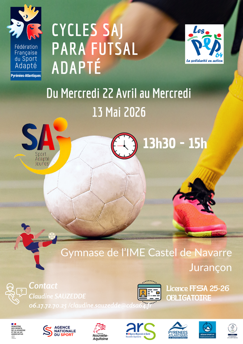 Activité Futsal : au gymnase de l'IME Castel de Navarre -1 impasse d'Oly - 64110 JURANCON - Horaires : 13h30-15h. Séances composées de plusieurs petits ateliers autour de l'ultimate Ce créneau est également le créneau de l'IME Castel de Navarre, et se pratique donc avec les autres jeunes de l'IME qui seront du nombre de 5 à 8 personnes, âgées de 15 à 18 ans.