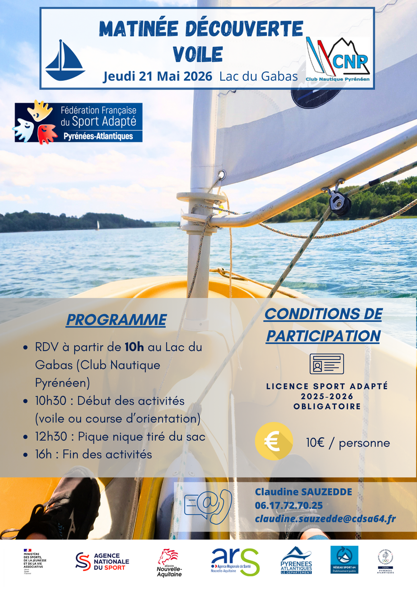 En partenariat avec le Club Nautique Pyrénéen, cette journée découverte de la voile est proposée chaque année sur le lac de Gabas à Lourenties (à proximité de Soumoulou).